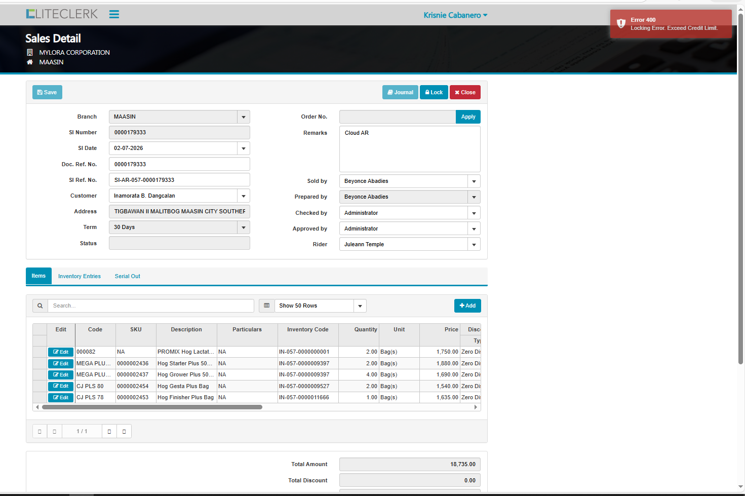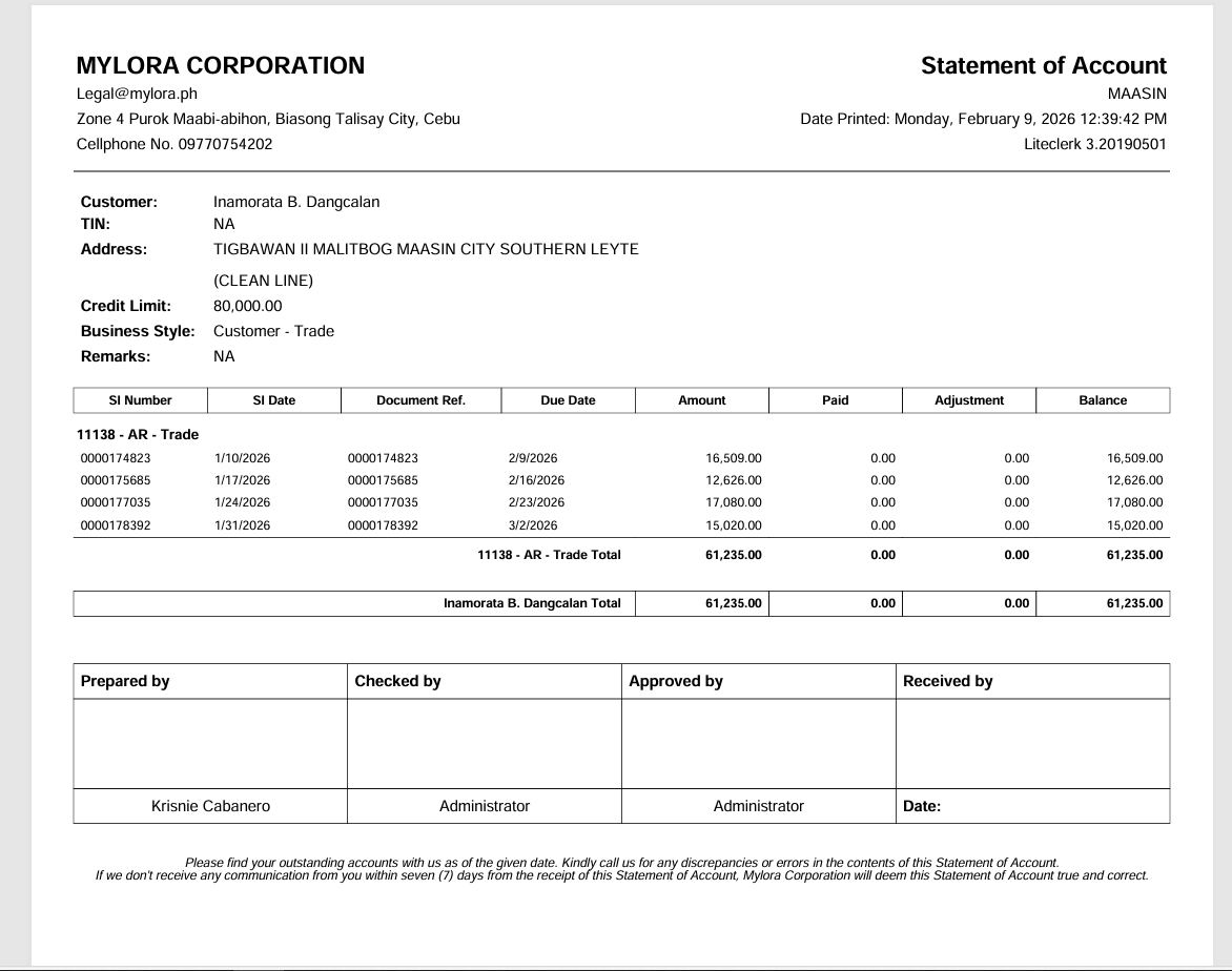 CUSTOMER: INAMORATA B. DANGCALAN