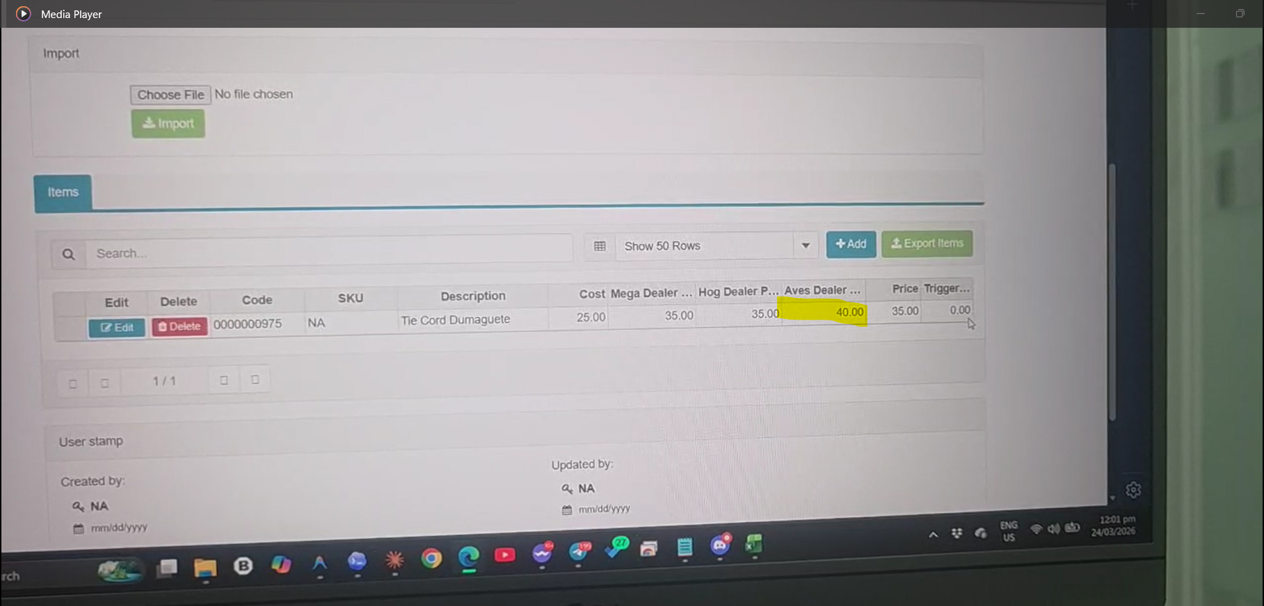 Asking for assistance on checking this bug in Item price import and export. after import sa excel sa gi update na price item sa aves dealer hogs dealer mega dealer and the price